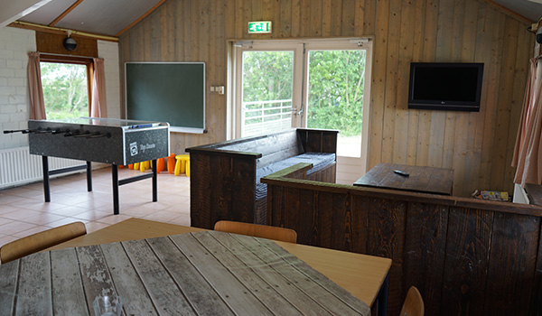Onder de overkapping bij de eetzaal staan picknickbanken waar je gezellig met elkaar kunt eten. Ook is er een groot speelveld met voetbaldoelen, volleybalnet, baskets en een tafeltennistafel.