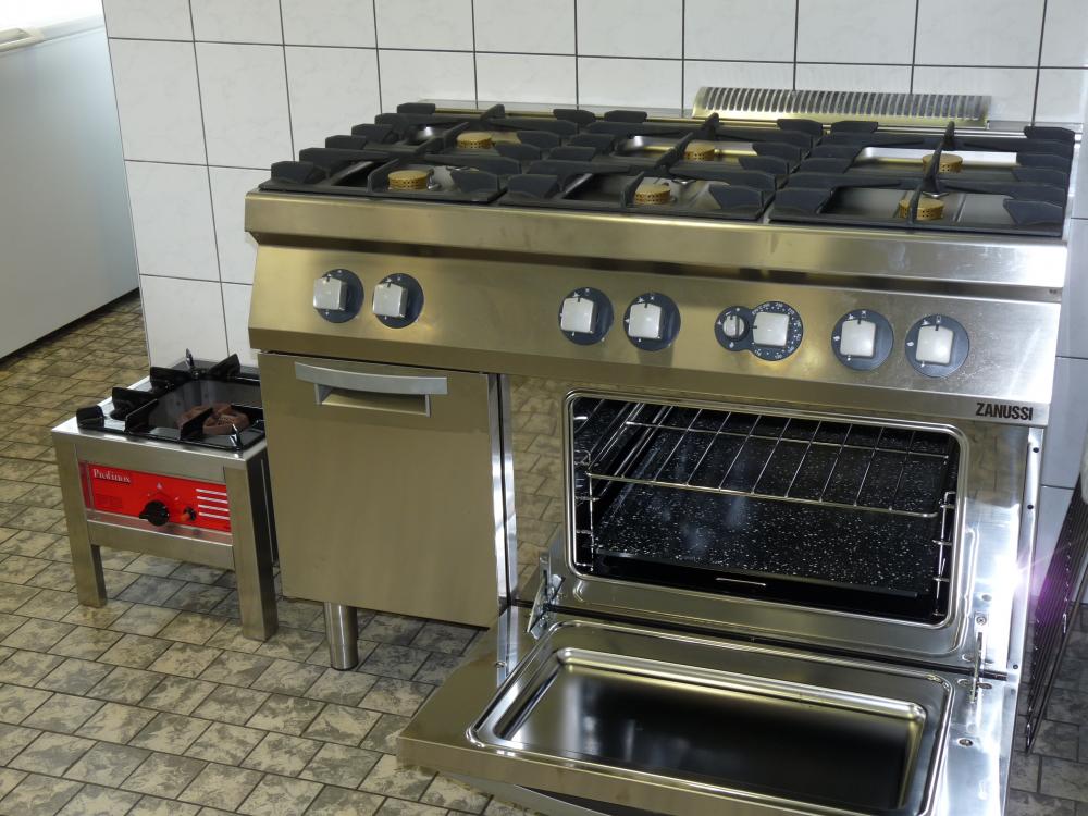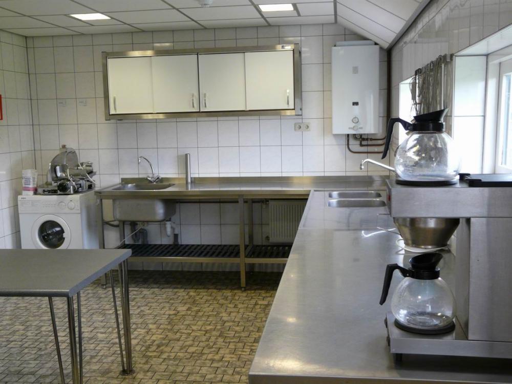 - Een professioneel ingerichte keuken met onder andere een groot fornuis met oven en een afwasmachine.